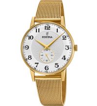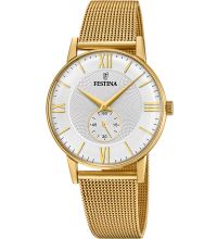 Zusätzliche Freude an Ihrer neuen Festina Uhr wird Ihnen das hochwertig verarbeitete Armband aus Edelstahl – Farbe: Gold – mit Klippschließe bereiten. Das Edelstahl-Armband bietet einen hohen Tragekomfort und kann bis zu einem maximalen Handgelenkumfang von 210 mm getragen werden.