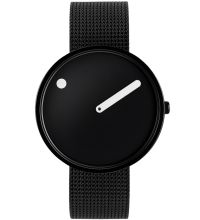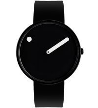 Picto® stellt die Idee einer klassischen Uhr mit zwei Zeigern und einem Zifferblatt mit Zahlen in Frage. Hier wird die Stunde durch einen Punkt auf dem drehbaren Zifferblatt angezeigt, während die Minuten durch einen herkömmlichen Zeiger angezeigt werden. |  |