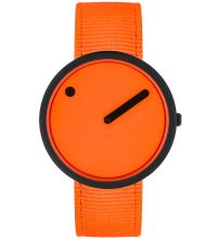 Picto® stellt die Idee einer klassischen Uhr mit zwei Zeigern und einem Zifferblatt mit Zahlen in Frage. Hier wird die Stunde durch einen Punkt auf dem drehbaren Zifferblatt angezeigt, während die Minuten durch einen herkömmlichen Zeiger angezeigt werden. |  |