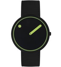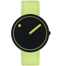 Picto® stellt die Idee einer klassischen Uhr mit zwei Zeigern und einem Zifferblatt mit Zahlen in Frage. Hier wird die Stunde durch einen Punkt auf dem drehbaren Zifferblatt angezeigt, während die Minuten durch einen herkömmlichen Zeiger angezeigt werden. |  |